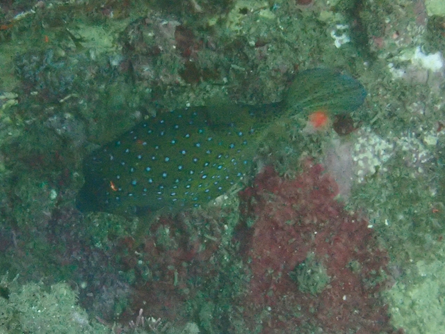雌は、褐色で、黒で囲われた白斑が点在します。尾びれにまで斑があります。
