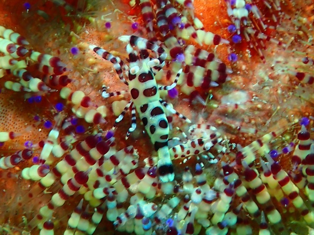 サンゴ礁域や岩礁域のフクロウウニに共生します。