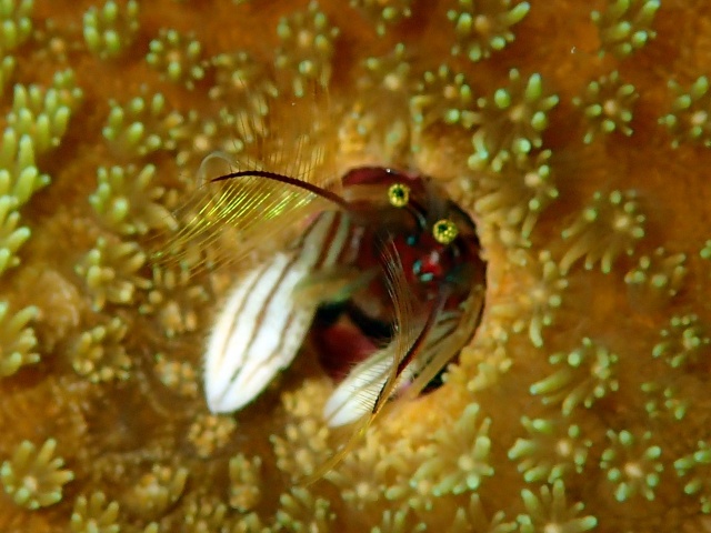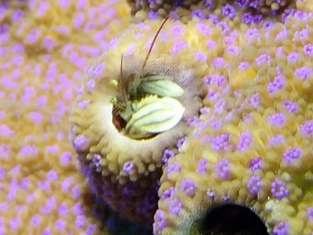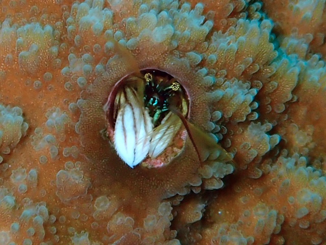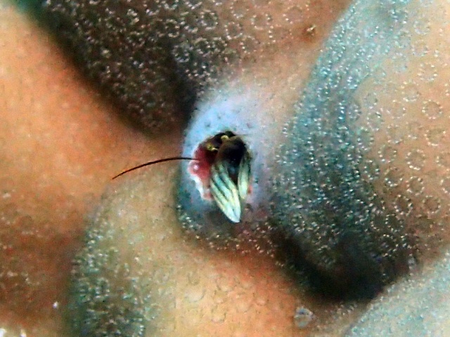 カンザシゴカイ類が作った石灰質の棲管に住み、顔やはさみ脚だけを出しています。