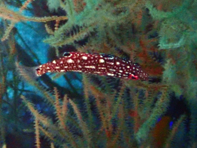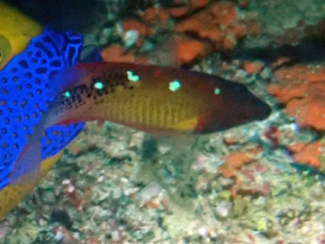 背ビレの付け根に並ぶ白色の斑と尾ビレ基部の黒色斑が特徴です。