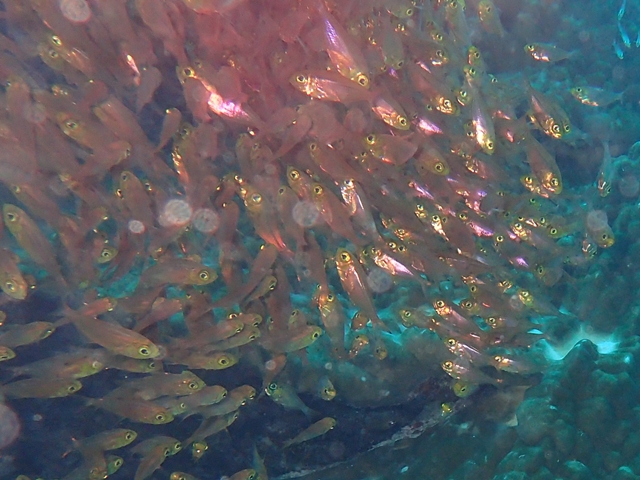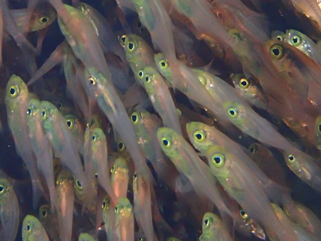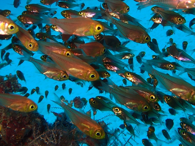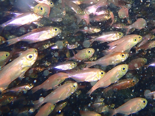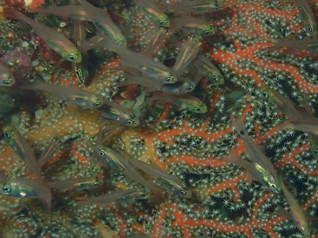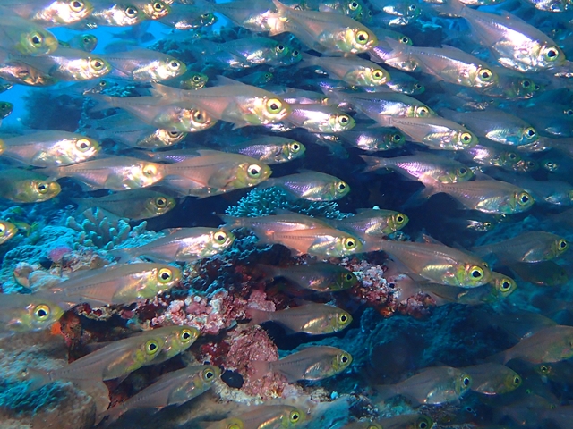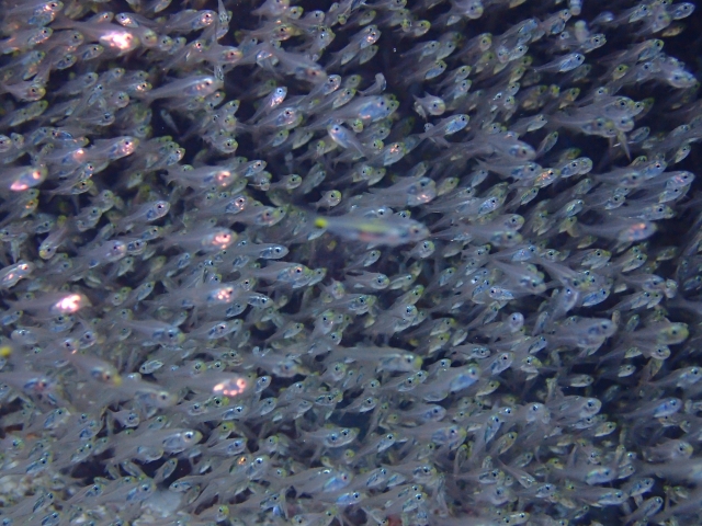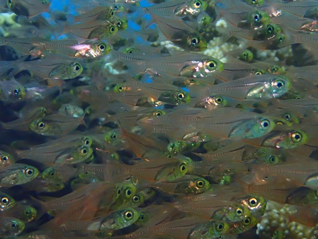 体長は6cm程の小型で、沿岸の岩礁域やサンゴ礁域で大きな群れを作ります。