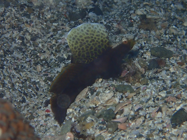 第1背ビレが黒褐色で円形に大きく、網目模様になっています。