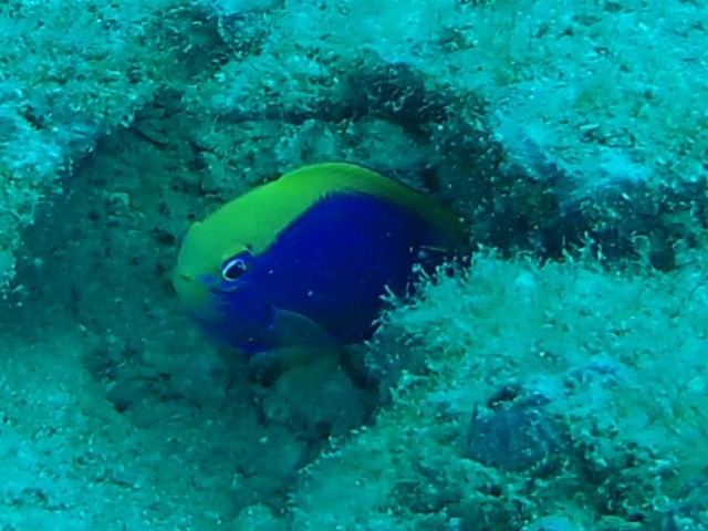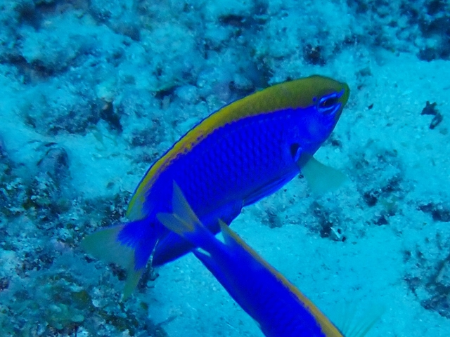 体色は鮮やかな青色で、吻から背中にかけて黄色の帯があります。