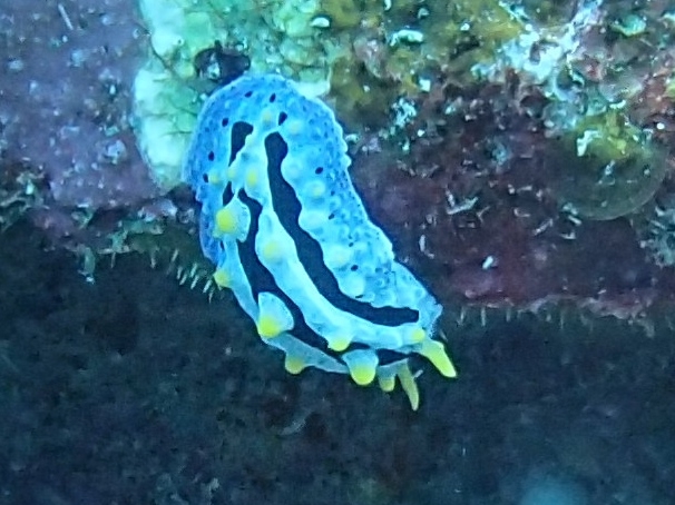 触角は黄色、ソライロイボウミウシに似ますが、正中線上が青灰色が本種です。