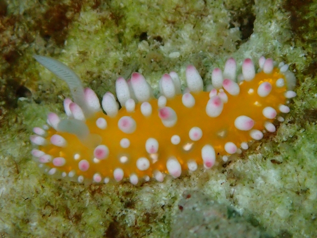 突起の先端はピンク色、触角、二次鰓は白色です。