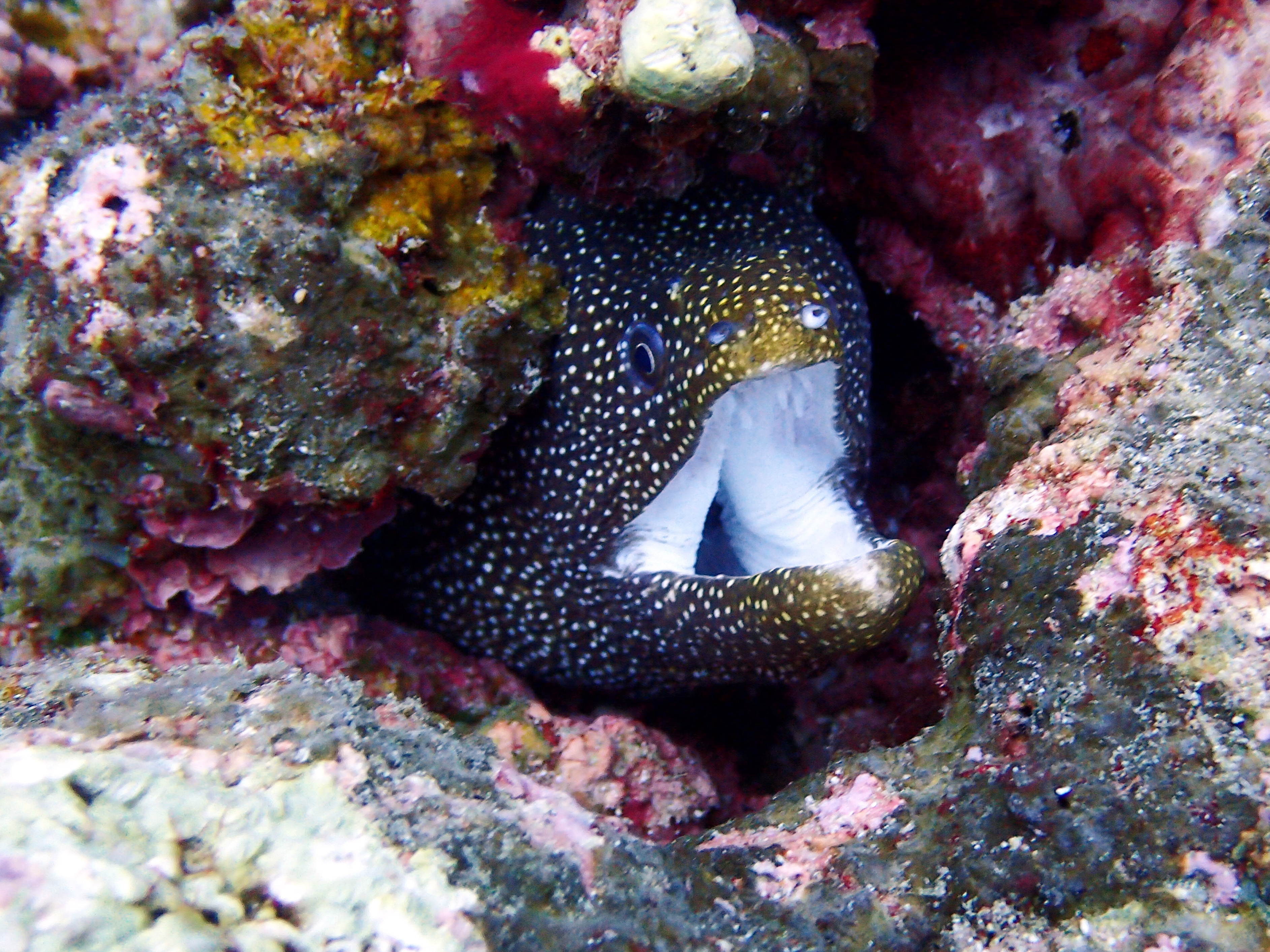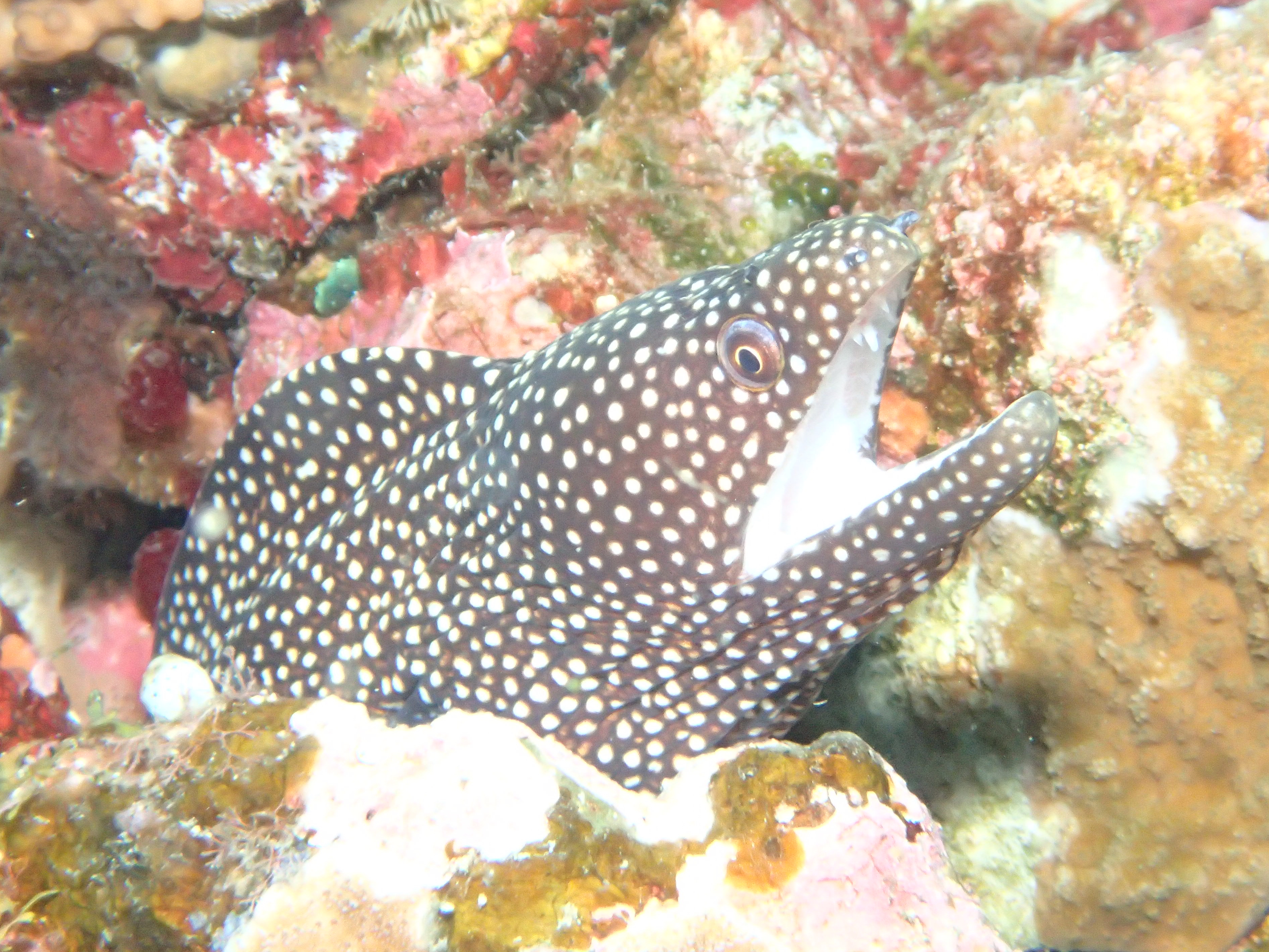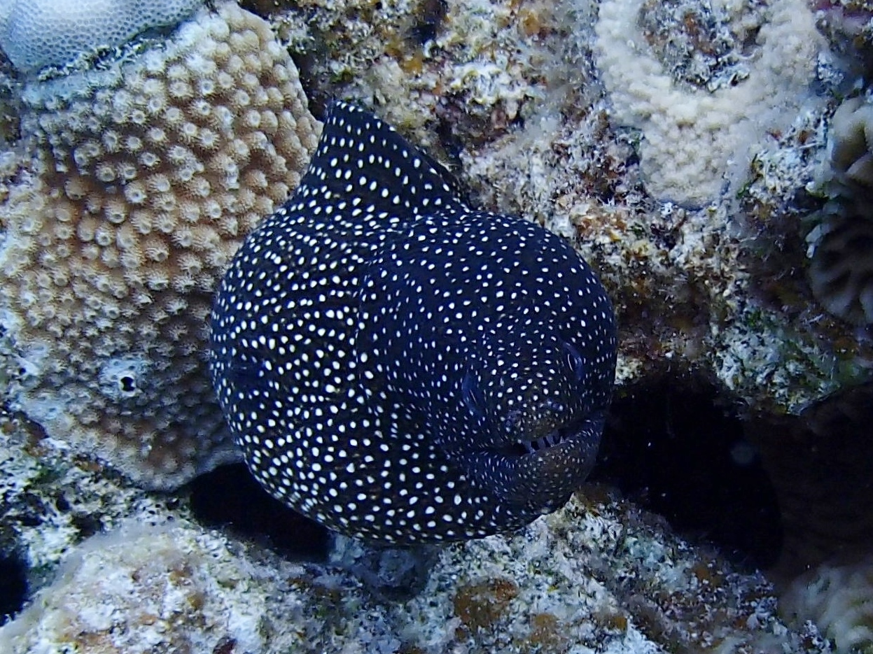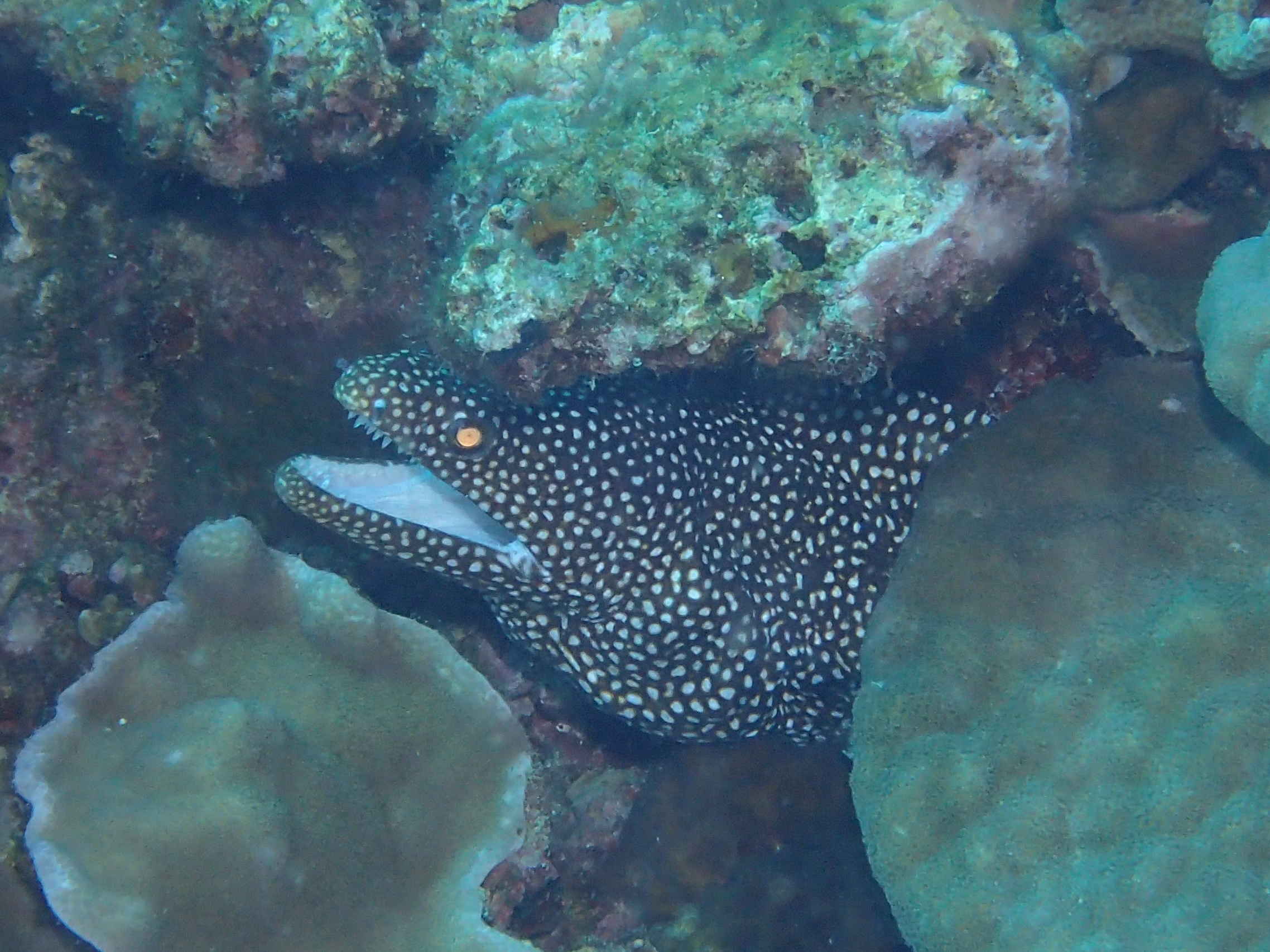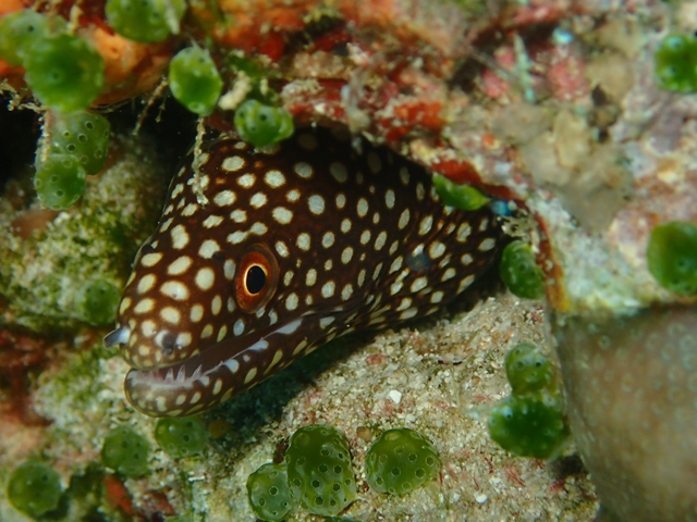比較的浅場のサンゴの間から顔を覗かせていることが多いです。