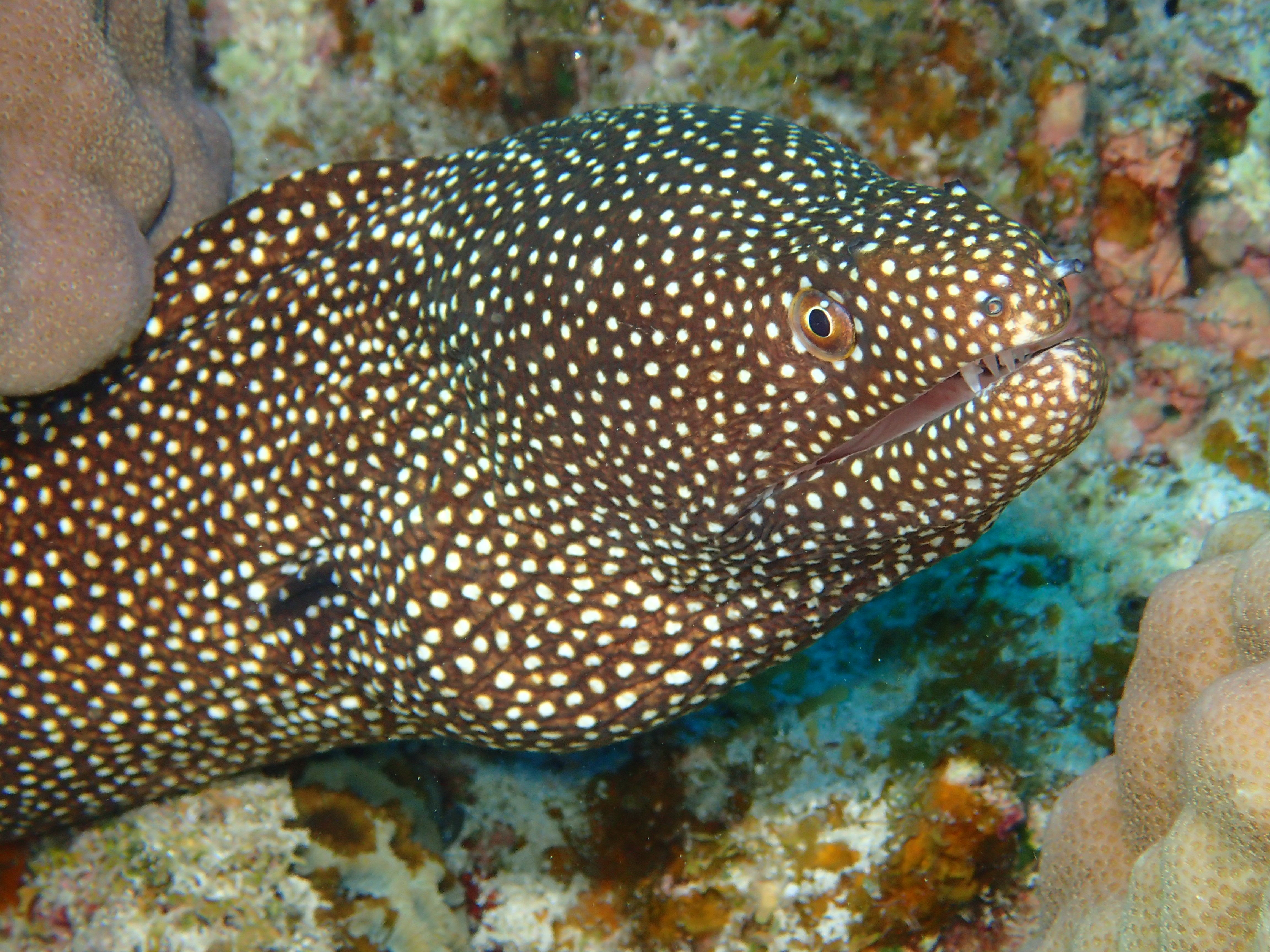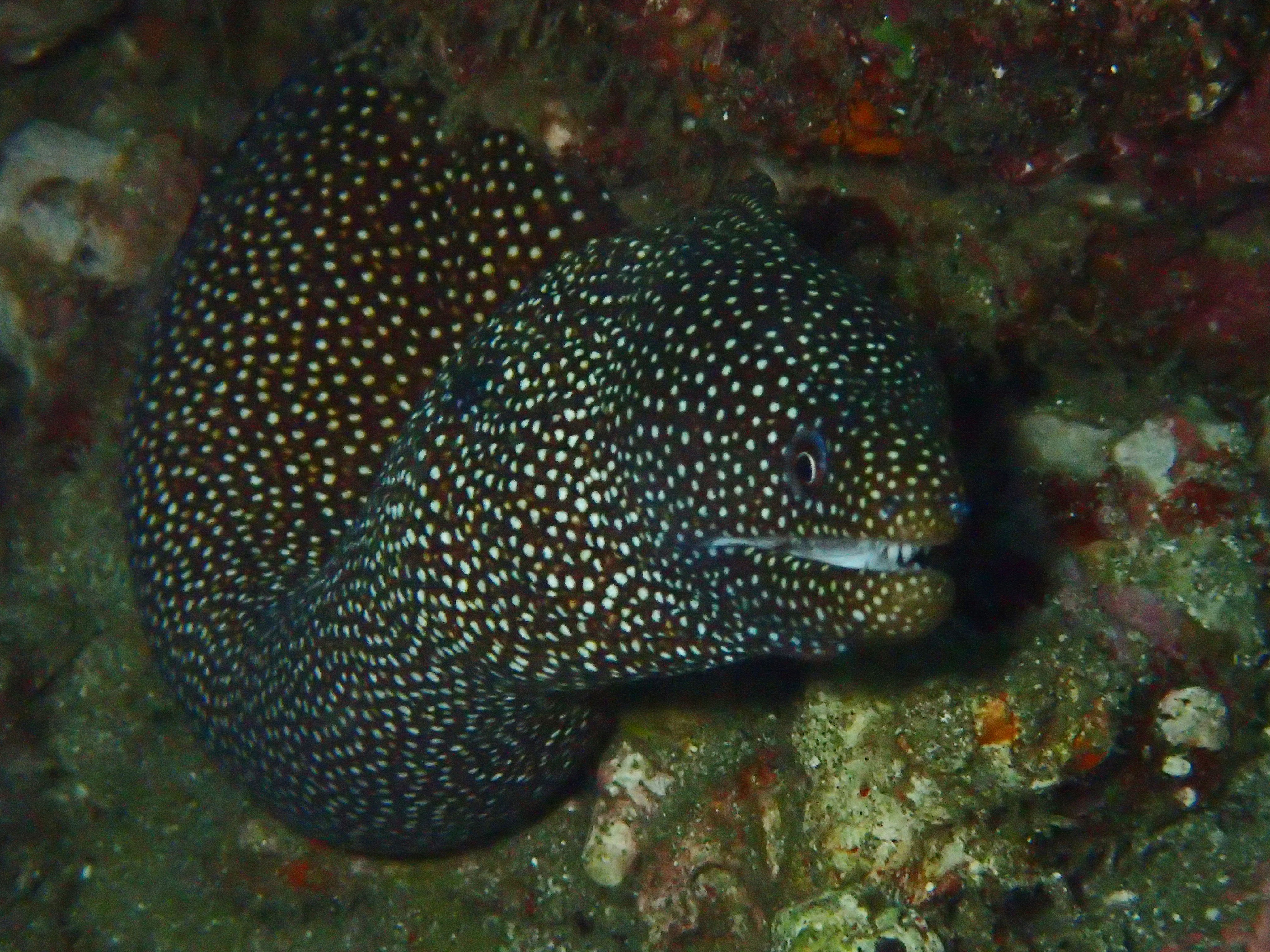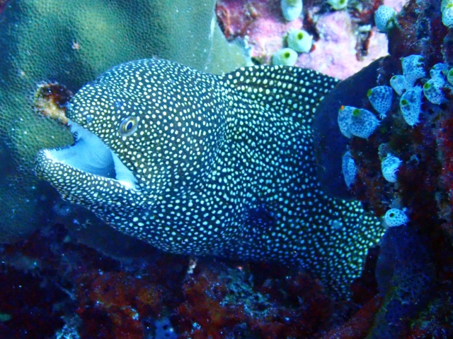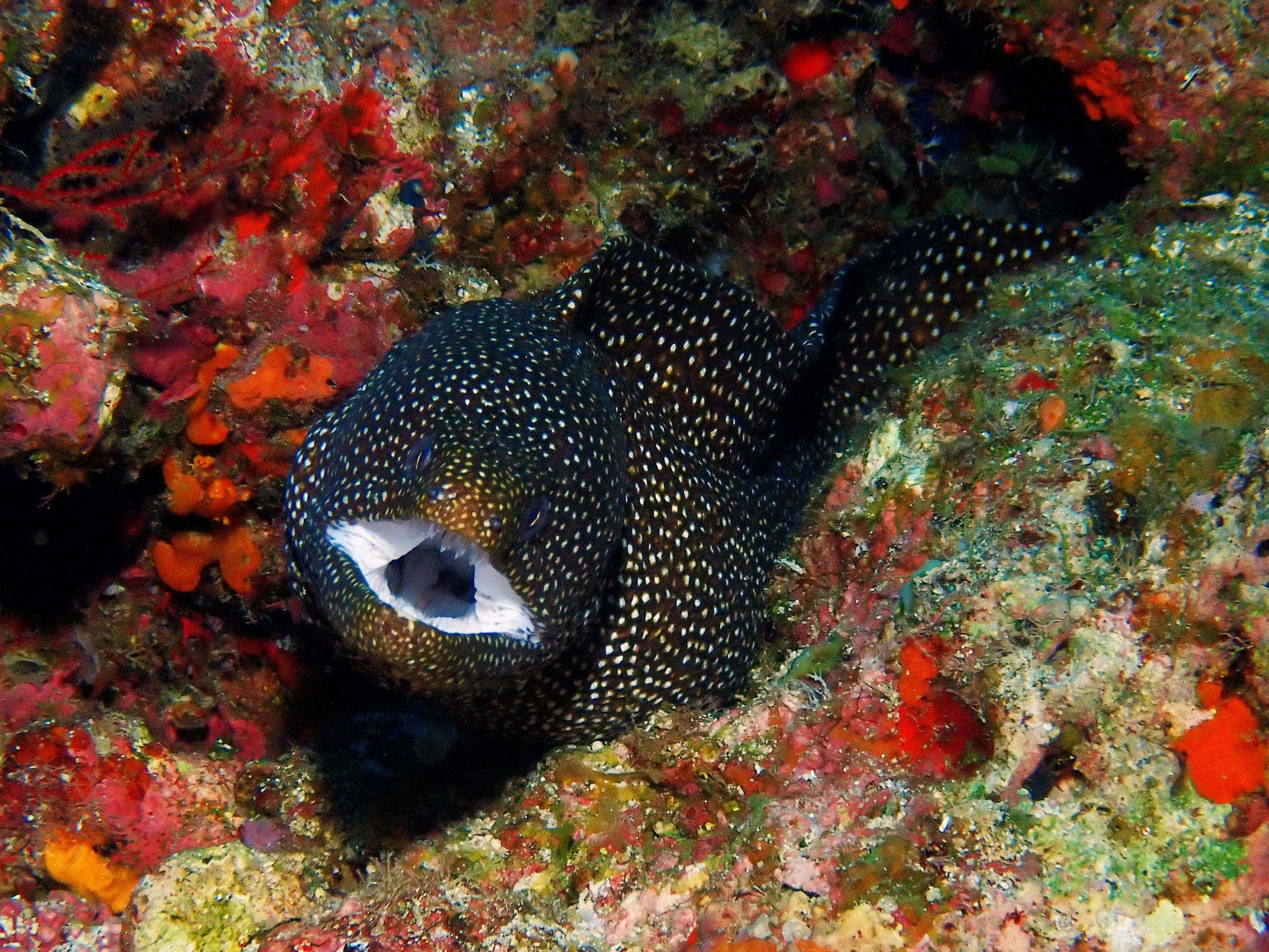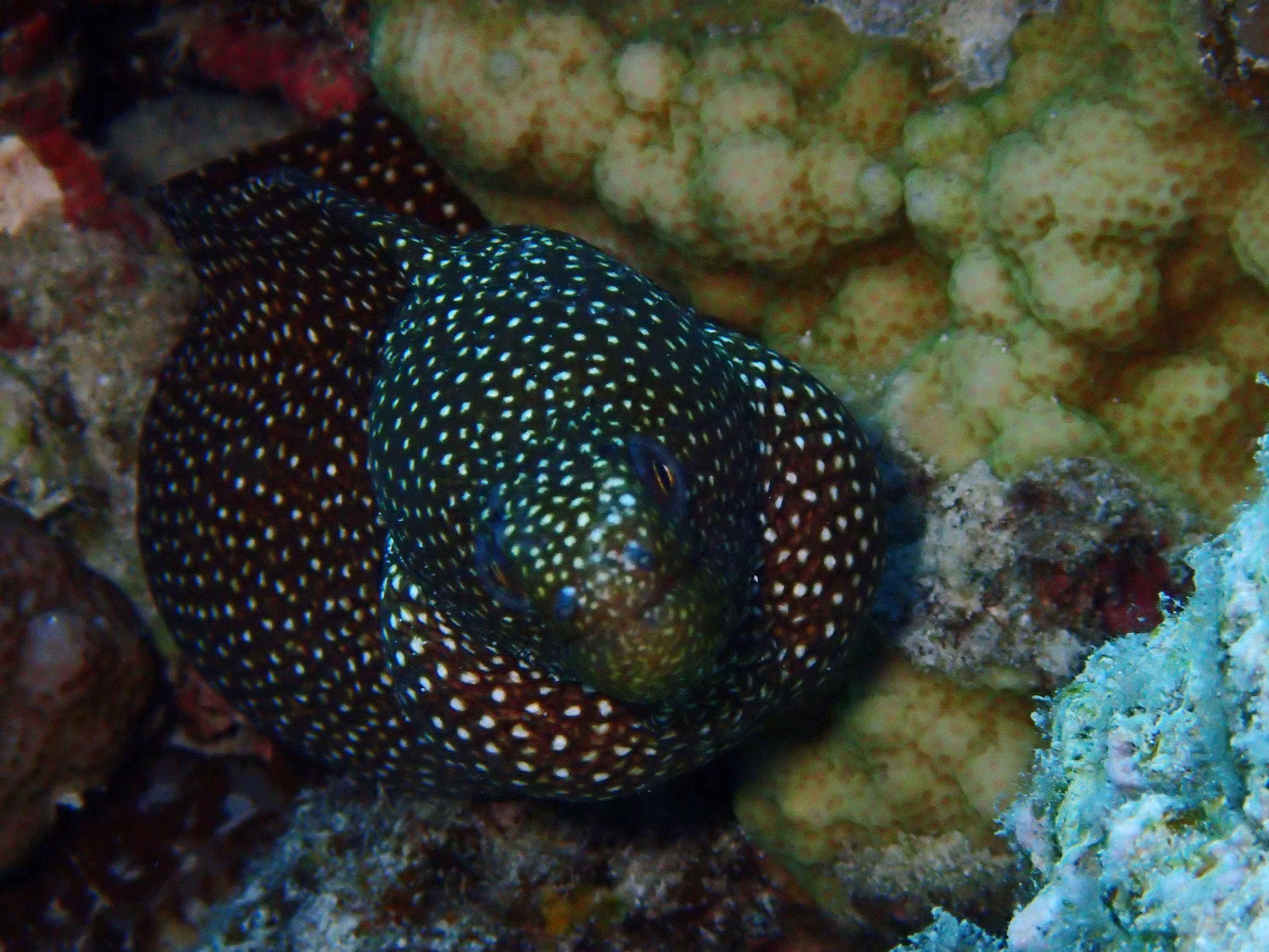 比較的浅場のサンゴの間から顔を覗かせていることが多いです。